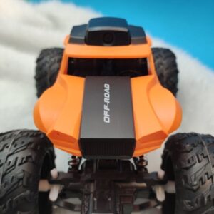 بله. یه جذابیت دیگه این ماشین کنترلی در اینه که طراحي جذاب از تارجي و مشكي با هم داره. این بدنه پلاستيك خوب علاوه بر مقاومت بدنه یه جلوه ی خاصی م به این ماشین میده. مثل ماشین های فیلم های تخیلی که هرچی تیر میخورن، هیچی شون نمیشه. اینم همینه. هرچی باهاش بکوبید به در دیوار، آخ نمیگه. ولی اینکار رو نکنید بهتره. چکاریه اخه ماشین آزاری. از قصد نکوبید. در مسیر اشتباها بكوبيد اشکالی نداره . بلاخره این ماشین کنترلی الکتریکی یه ماشین کنترلی آفروده که قراره باهاش بزنید به دل بیابون و جاده ولی نگران نباشید. این پسر خوب بلده از پس خودش بر بیاد.